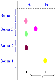 Остаток эфирного экстракта из основного раствора (с предыдущего занятия) растворяют в небольшом объеме хлороформа (3 мл) насыщенного аммиаком (для нейтрализации хлористоводородной кислоты и переведения оснований в молекулярную форму) и наносят в 2 зоны (А и Б) на стартовую линию хроматографической пластинки размером 5× 10 см.