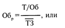 ТЗ — товарный запас на конец анализируемого периода (руб.); Т/Ободн. — однодневный товарооборот за анализируемый период (руб.); Т/Об — объем товарооборота за анализируемый период (руб.); Д — количество дней в анализируемом периоде. Уровень товарных запасов характеризует обеспеченность торгового предприятия запасами на определенную дату и показывает, на какое число дней торговли (при сложившемся товарообороте) хватит этого запаса. Вторым важнейшим показателем, характеризующим товарные запасы, является показатель товарооборачиваемости. Товарооборачиваемость, будучи одним из показателей эффективности хозяйственной деятельности торгового предприятия в целом, позволяет оценить и количественно измерить два параметра, присущие товарным запасам: время и скорость их обращения. Время товарного обращения, или товарооборачиваемость в днях товарооборота, рассчитывается по следующей формуле: