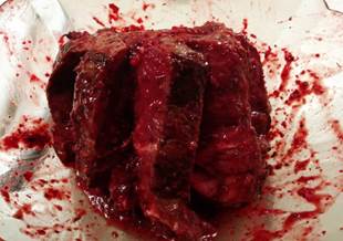 Говядина-400 г-500г Приправа(базилик, орегано, майоран) я брала смесь итальянские травы Соль Клюква— 3-4 ст. л. Горчица— 1 ч. л. Вино красное сухое(либо яблочный уксус 1 ч.л.)— 2-3 ст. л. Мед — 2 ч. л. Чеснок — 3-4 зуб. Перец черный душисты(горошком) — 2 шт Гвоздик— 1-2 шт Петрушка или укроп— 0.5 пуч.