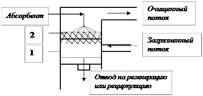 Показателями абсорбционных методов являются степень очистки (ПДК) и коэффициент массопередачи, которые зависят от растворимости газа в абсорбенте, технологического режима в реакторе, скорости химических реакций и др. Абсорбционные методы характеризуются непрерывностью и универсальностью процесса, экономичностью и возможностью извлечения больших количеств примесей из газов. Недостаток этих методов состоит обеспечивают высокую степень очистки только при большом числе ступеней очистки. Поэтому технологические схемы мокрой очистки, как правило, сложны. Многоступенчаты и реакторы имеют большой объем. Адсорбция – основана на селективном поглощении вредных газов и паров твердыми адсорбентами, имеющими развитую микропористую удельную поверхность (Sуд – отношение поверхности к массе, м2/г). В адсорберах очищаемый газовый поток пронизывает снизу вверх слой адсорбента, который состоит из зернистого материала (см. рис.4). При этом вредные примеси связываются адсорбентом и впоследствии могут быть выделены из него. Применяются адсорберы с неподвижным фильтрующим слоем (прерывистого действия) и адсорберы непрерывного действия, в которых адсорбент медленно перемещается и одновременно очищает проходящий через него поток.