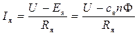 где n – скорость (частота) вращения, об/мин; Ф – магнитный поток полюсов двигателя, Вб. По закону Ленца индуктированная ЭДС E я направлена против тока обмотки якоря I я, а следовательно, против приложенного к зажимам двигателя напряжения U. Поэтому ЭДС якоря двигателя называют противо-ЭДС. Приложенное к зажимам якоря двигателя напряжение должно уравновешивать эту противо-ЭДС E я и падение напряжения в цепи якоря I я R я на сопротивлении обмотки и переходном сопротивлении контактов щеток и коллектора. Тогда основное уравнение для двигателя, работающего с постоянной скоростью (частотой) вращения, можно записать в виде