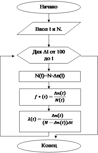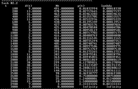 ЗАДАЧА №1 1) В течение 2000 часов наблюдали за 480 видеоадаптерами. Определить статистическую вероятность безотказной работы этих устройств, если в течение указанного срока зарегистрировано 52 отказа, причем 12 из них произошли в первые 400 часов. 2) p*(t) – статистическая вероятность безотказной работы через t часов. q(t) – статистическая вероятность отказов через t часов. N – число поставленных на эксплуатацию приборов. Δ n(t) - число отказавших ко времени t приборов. N(t) – число приборов, оставшихся работоспособными к моменту времени t. 3) 4) Fortran: