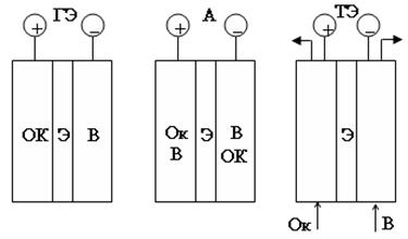 Рисунок 2.1 - Схемы электрохимических элементов ХИТ: Ок – окислитель; В – восстановитель; Э – электролит.