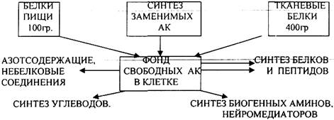 Все эти вещества выводятся из организма с мочой. В норме реакция на индол должна быть отрицательна. При положительной реакции на индол - нарушена детоксикационная функция печени. Положительная реакция на ИНДИКАН наблюдается при очень активном гниении белков в толстом кишечнике. Лекция № 17. Обмен белков (продолжение). 1. ИСТОЧНИКИ АМИНОКИСЛОТ В КЛЕТКЕ И ПУТИ ИХ ИСПОЛЬЗОВАНИЯ. 2. МЕТАБОЛИЗМ АМИНОКИСЛОТ. 3. ОБРАЗОВАНИЕ АММИАКА И ПУТИ ЕГО ОБЕЗВРЕЖИВАНИЯ. СИНТЕЗ МОЧЕВИНЫ. Источниками аминокислот в клетке являются: 1. белки пищи после их гидролиза в органах пищеварения, 2. синтез заменимых аминокислот, 3. распад тканевых белков. Тканевые белки подвергаются гидролитическому расщеплению при участии тканевых ПРОТЕАЗ - КАТЕПСИНОВ, которые в основном находятся в ЛИЗОСОМАХ, но могут быть и в МИТОХОНДРИЯХ и ЭПС. Эти ферменты обладают специфичностью действия. Выделяют разные КАТЕПСИНЫ. которые отличаются оптимумом рН и специфичностью действия на ПЕПТИДНЫЕ связи. Распад тканевых белков необходим для обновления белков, а также для устранения дефектных молекул белка.