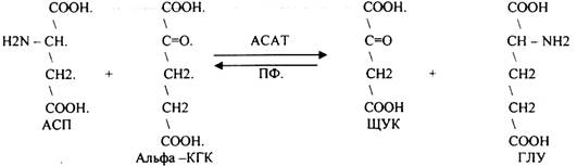 АМИНОТРАНСФЕРАЗА. Она локализуется в МИТОХОНДРИЯХ и ЦИТОПЛАЗМЕ. ТРАНСАМИНИРОВАНИЮ могут подвергаться все аминокислоты кроме ЛИЗ и ТРЕ. В организме человека обнаружено 10 различных АМИНОТРАНСФЕРАЗ. Наибольшее значение имеют AT, донорами аминогрупп которых являются АЛА, АСП, ГЛУ. ГЛУТАМИНОВАЯ кислота является универсальным донором, а альфа -КГК - универсальным акцептором аминогрупп.