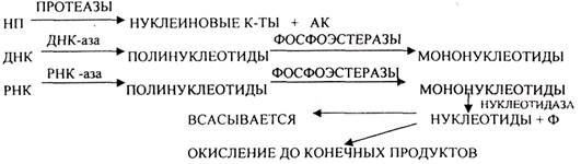 ТРИПСИН, ХИМОТРИПСИН, ЭЛАСТАЗА - ЭНДОПЕПТИДАЗЫ. ТРИПСИН разрушает внутренние ПЕПТИДНЫЕ связи, в образовании которых принимают участие ЛИЗ и АРГ. ХИМОТРИПСИН разрушает внутренние связи, в образовании которых принимают участие ароматические аминокислоты (ТИР, ТРИ, ФЕН). ЭЛАСТАЗА разрушает внутренние ПЕПТИДНЫЕ связи, в образовании которых принимают участие АЛА, ГЛИ, ПРО, ЦИС. В результате действия ПЕПСИНА, ХИМОТРИПСИНА и ЭЛАСТАЗЫ высокомолекулярные ПЕПТИДЫ расщепляются до низкомолекулярных, которые подвергаются действию ЭКЗОПЕПТИДАЗ, действующих на крайние связи, отщепляя отдельные концевые аминокислоты. КАРБОКСИПЕПТИДАЗА разрушает крайние связи, отщепляя аминокислоты с С-конца. АМИНОПЕПТИДАЗА действует на крайние ПЕПТИДНЫЕ связи со стороны N-конца, отщепляя отдельные аминокислоты. ДИПЕПТИДЫ подвергаются действию ДИПЕПТИДАЗ, продуцирующихся слизистой кишечника сразу в активной форме. Т.о. в результате действия всей этой группы ферментов в ЖКТ белки пищи расщепляются до аминокислот. Образующиеся аминокислоты всасываются стенкой кишечника в кровь и поступают во все органы и ткани. Не всосавшиеся аминокислоты поступают в толстую кишку, где подвергаются процессам гниения. Это процесс бактериального распада веществ под действием микрофлоры или ферментов, вырабатывающихся этой микрофлорой. В норме в толстой кишке подвергаются аминокислоты, а при патологии - белки. Это происходит и в других отделах ЖКТ: в желудке (при понижении кислотности), ротовой полости (при кариесе).