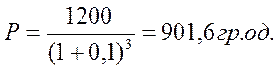 Приклад: потрібно визначити сучасну величину платежу для нарощеної суми в 1200 гр.од., яка буде отримана через три роки при річній процентній ставці 10%: