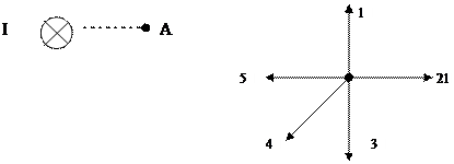 $$$ 25 Суретте I тогы бар ө ткiзгiштiң қ има беті кө рсетiлген. Ө ткiзгiштегi электр тогы бiзден сурет жазық тығ ына перпендикуляр бағ ытталғ ан. Суретте кө рсетiлген А нү ктесiндегi қ андай бағ ыт магнит индукциясы векторының бағ ытымен сә йкес болады?