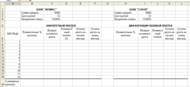 ЗАДАЧА: Банк «ФЕНИКС» предлагает кредит в 5000 у.е. на 12 месяцев под 13% годовых. Выплаты кредита ежемесячно равными частями (аннуитет). Банк «СОКОЛ» предлагает аналогичные условия, но с дифференцированными выплатами. Дополнительные комиссии в обоих случаях не предусматриваются. Сколько заемщик заплатит банку «Феникс» и банку «Сокол»? РЕШЕНИЕ: 1. Откройте ранее созданный файл Информационные системы.xls, активируйте Лист5 и присвойте данному листу имя: Лаб_5. 2. Создайте следующие таблицы (см. рис. 16).