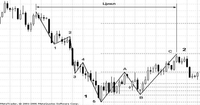 Хвилі Елліотта – це одна з форм прояву діючих на ринку протиборчих сил творення і руйнування. Основними положеннями теорії Елліотта є такі: · за дією слідує протидія; · головна тенденція складається з п'яти хвиль, за якими слідують три хвилі корекції (модель " 53"). · модель " 53" утворює повний цикл і є, у свою чергу, складовою частиною моделі " 53" більш високого рівня. · модель " 53" завжди незмінна, варіюється лише тривалість її формування у кожному конкретному випадку. На рисунку показано вісім хвиль, які створюють базову модель " 53". Вони позначені цифрами 1, 2, 3, 4, 5 і буквами а, b і с. Хвилі 1, 3 і 5 носять назву імпульсних хвиль. Хвилі 2 і 4 називаються коректуючими. Хвилі а, b і с – це корекція головної тенденції, утвореної хвилями 1-5. Головна тенденція, формована хвилями 1-5, може бути як висхідною, так і низхідною. Хвилі а, b і с завжди рухаються в напрямку, протилежному руху хвиль 1-5. Якщо розглядати хвилі з погляду біржової психології, можна відзначити такі індивідуальні особливості кожної хвилі: Хвиля 1. Може бути дуже сильна, якщо є новим явищем (тобто підйом після тривалого спаду), або слабшою, коли подібні рухи не нові. У будь-яком разі цю хвилю супроводжує атмосфера нерішучості: ніхто не впевнений, що попереднє падіння ціни вже закінчилося, і багато хто чекає його повернення. Хвиля 2. Розвивається в атмосфері страху. Деякі гравці вважають її поверненням ведмежого ринку і починають продаж. Ця хвиля звичайно досить глибока. Хвиля 3. Впевнений і сильний підйом цін. Така хвиля супроводжується великим обсягом торгівлі і значним відкритим інтересом. По ній з найбільшою впевненістю можна ідентифікувати п'ятихвильову діаграму. Найбільш вигідно укладати угоди саме в цей час. Хвиля 4. її глибина звичайно невелика й добре передбачувана. Ринок ще досить сильний, але вже має потребу у відпочинку. Хвиля 5. Виглядає не такою вражаючою, як хвиля 3. Навіть якщо вона досить тривала, обсяг торгівлі невеликий. При цьому найбільший ажіотаж у навколоринкової публіки, а найбільш інформовані кити починають потроху закривати довгі позиції і ближче до кінця відкривати короткі. Хвиля А. Публіка переконана, що спад лише тимчасовий, і продовжує купувати. Кити починають масові продажі. Хвиля В. З ринком діється щось дивне. Рух нагору не вдається, і потроху починають здаватися навіть найбільш переконані бики. Хвиля С. Майже так само сильна, як хвиля 3. Багато хто вважає її підтверджуючою новий ведмежий тренд, інші поспішають закрити збиткові позиції. На рис. 14 представлена модель Елліотта з практичної сторони.