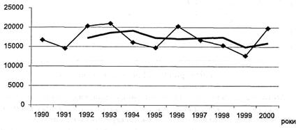 За теорією хвиль Елліотта, кожна окрема хвиля повного циклу, у свою чергу, є повним циклом " 53" більш низького рівня. Найбільша хвиля називається Великим надциклом. Великий надцикл складається з надциклів, а надцикли з циклів. Продовжуючи це дроблення, одержимо спочатку основну хвилю, потім проміжну, малу, надмалу і найдрібнішу хвилі. Виявлені в процесі графічного аналізу типи цінових хвиль і послідовність їх змінюваності в рамках довгострокових коливань рівня ціни дозволяють здійснювати прогнозування цього показника на наступний середньостроковий період. Торговельна стратегія з використанням хвильової теорії Елліотта дає можливість виявляти поворотні точки на ринку. Визначивши майбутні появи максимумів і мінімумів будь-якого цінового руху, можна віддати своєчасний наказ про продаж або купівлю. Ризик підписання угоди знижується до прийнятного рівня, а можливий прибуток збільшується завдяки тому, що момент прийняття рішення про відкриття торговельної позиції розраховується дуже близько до екстремальних значень ціни. Хвильова Теорія Елліотта довела свою працездатність не тільки при прогнозуванні цін на різних ринках, а й при передбаченні реальних подій. 3. Теорія змінної середньої є однією з найсучасніших в системі прогнозного апарату технічного аналізу. Ця теорія дозволяє доповнити графічні методи аналізу динаміки рівня цін відповідними математичними розрахунками їх тренда. Головним принципом теорії змінної середньої є згладжування конкретних значень рівня цін в процесі графічного їх аналізу в рамках визначеного проміжку часу. Для аналізу коливання рівня цін в середньостроковому періоді їх змінне середнє значення розраховується в рамках тижневого інтервалу, а в середньостроковому періоді – в рамках одно-двомісячного інтервалу. При розрахунку змінної середньої використовуються формули середньоарифметичної зваженої, середньоарифметичної експоненціальної, середньої хронологічної й інших алгоритмів обчислення середніх значень в динаміці. Отримані показники динаміки рівня цін дозволяють нівелювати нетипові (випадкові) екстремальні їх значення в процесі графічного аналізу і будувати більш наочну тенденцію їх вимірювання. При цьому в цілях зіставлення цінові графіки динаміки можуть відображати тенденції, одержані за результатами розрахунків середніх значень різними методами. Лінія змінної середньої відкладається прямо на графіку руху ціни. Загальний принцип роботи зі змінними середніми формулюється так – якщо лінія змінної перебуває нижче цінового графіка, то ціновий тренд є бичачим, а якщо вище, то тренд – ведмежий. При перетинанні графіка ціни зі змінною середньою ціновий тренд змінює напрямок (рис. 15).