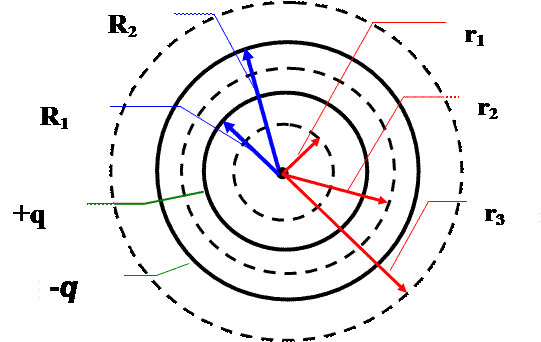 ρ = q /V 1. r1 < R1 q = 0 → E1 = 0 2. R1 < r2 < R2