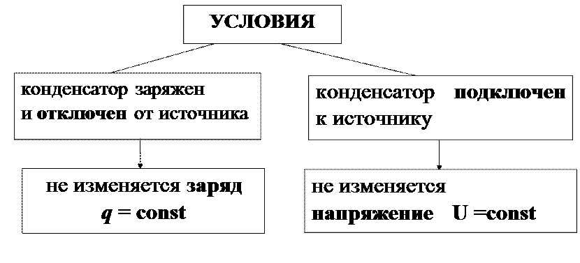 Если конденсатор остается подключенным к источнику, то q ≠ const, а