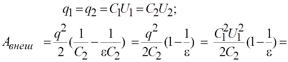 Если конденсатор отключили от источника, то напряжение уменьшается, но остается q = const. Энергия конденсатора: