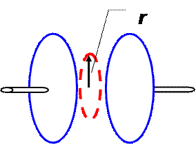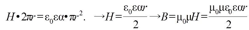 10. Напряженность электрического поля внутри круглого плоского конденсатора растет со временем: Е = α t. Определите индукцию магнитного поля внутри конденсатора на расстоянии r от его центра.