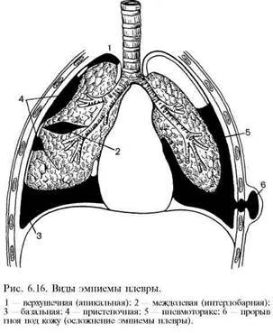 По клиническому течению эмпиемы плевры подразделяют на острые и хронические. А. Острые (длительность заболевания до 8 нед). Б. Хронические (длительность заболевания более 8 нед). Как острые, так и хронические эмпиемы разделяют следующим образом. I. По характеру экссудата: а) гнойные; б) гнилостные. II. По характеру микрофлоры: а) специфические (туберкулезные, грибковые, т. е. микотические); б) неспецифические (стафилококковые, диплококковые, анаэробные и др.); в) вызванные смешанной микрофлорой. III. По распространенности процесса: а) свободные эмпиемы: тотальные (при рентгенологическом исследовании легочной ткани не видно), субтотальные (определяется только верхушка легкого); б) ограниченные (осумкованные вследствие образования шварт). IV. По локализации ограниченные эмпиемы разделяют на: а) пристеночные, б) базальные (между диафрагмой и поверхностью легкого), в) интерлобарные (в междолевой борозде), г) апикальные (над верхушкой легкого), д) парамедиастинальные (прилежащие к средостению), е) многокамерные, когда гнойные скопления в плевральной полости расположены на разных уровнях и разделены между собой спайками (рис. 6.16). V. По характеру патологического процесса в легком, являющегося причиной эмпиемы: а) парапневмонические (сочетание эмпиемы с пневмонией); б) сочетанные с деструктивным процессом в легком (абсцесс, гангрена легкого); в) метапневмонические (нагноение абактериального парапневмонического плеврита или гидроторакса). VI. По характеру сообщения с внешней средой: а) закрытые, не сообщающиеся с внешней средой; б) открытые эмпиемы с плевроорганным, бронхоплевральным или плеврокожным свищом. Клиническая картина и диагностика. Все формы острой эмпиемы плевры имеют общие симптомы: кашель с выделением мокроты, одышка, боли в груди, повышение температуры тела, а также признаки интоксикации организма. По современным представлениям, клиника эмпиемы плевры укладывается в картину тяжелого синдрома системной реакции на воспаление, которая при несвоевременных лечебных мероприятиях может дать начало развитию сепсиса и полиорганной недостаточности. При закрытой эмпиеме кашель сопровождается выделением небольшого количества мокроты. Длительные и частые приступы кашля с отделением значительного количества мокроты, как правило, свидетельствуют о наличии бронхоплеврального свища. Особенно большое количество мокроты больные отделяют в положении на здоровом боку, когда создаются условия для улучшения оттока гноя. При тотальной эмпиеме больные из-за резкой боли и одышки не могут лежать и принимают положение полусидя. При отграниченных эмпиемах болевой синдром выражен слабее. Не принимая вынужденного положения, больные чаще лежат на пораженной стороне грудной клетки, что ограничивает ее дыхательные экскурсии, а вместе с этим уменьшает боль.