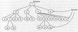 2. Все узлы, кроме корня, связываются с одним и только одним узлом на более высоком уровне по отношению к ним самим. Такое определение в части организации связей совпадает со списком, и, в частности, список представляет вырожденный случай дерева, в котором каждая вершина имеет не более одного поддерева. Еще раз отметим, что деревья здесь рассматриваются как средство и для логического, и для физического представления данных. В логическом описании данных они используются для определения связей между элементами структуры, а при определении физической организации данных — для определения набора указателей, реализующих связи между ними. Использование ссылок для организации доступа к отдельным элементам структуры не позволяет сократить процедуру поиска, в основу которой положен последовательный перебор. Процедура поиска будет эффективнее, если будет предварительно установлен некоторый порядок перехода кследующему элементу дерева. Такой порядок в ряде случаев определяется в отношении метода обхода и регулярности итераций, определяемой длиной пути и кратностью деления вершины. Выделяют [2] три метода обхода: сверху вниз, слева направо, снизу вверх. Регулярность обхода дерева может быть связана с упорядоченными деревьями, к которым относятся сбалансированные и двоичные деревья. Сбалансированное дерево в каждом узле имеет одинаковое число ветвей, причем процесс включения новых ветвей в узлы дерева идет сверху вниз, а на каждом уровне дерева — слева направо. Для дерева