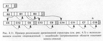Использование указателей на «подобные» и «порожденные» Для обеспечения эффективных процедур выборки записей могут использоваться межзаписные ссылки следующих типов: • указатели на порожденные записи; • указатели на подобные записи; • указатели на исходные записи. При построении древовидных структур, в которых используется какой-либо один тип указателя, всегда исходят из альтернативы между сложностью реализации списка указателей переменной длины на порожденные записи и увеличением времени поиска, связанным с использованием цепочки указателей на подобные записи. Практически эффективные компромиссы могут быть достигнуты путем использования в каждой записи двух указателей каких-либо двух типов (рис. 4.11), а также использованием кольцевых структур (например, рис. 4.12). На рис. 4.12 ссылки образуют кольца двух типов: подобных записей и кольца «исходный — порожденный». В записях самого нижнего уровня показаны указатели на исходные записи. Для единообразия здесь каждая запись имеет два указателя. Однако кольца большей частью создаются двусторонними. В этом случае число указателей в каждой записи увеличится до четырех.