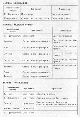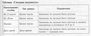 Все таблицы базы данных «Сессия» находятся в третьей нормальной форме: • каждый столбец таблицы неделим, и в рамках одной таблицы нет столбцов с одинаковыми по смыслу значениями (1НФ); • первичные ключи однозначно определяют запись и не избыточны, все поля каждой из таблиц зависят от ее первичного ключа (2НФ); • значение любого поля, не входящего в первичный ключ, не зависит от значения другого поля, тоже не входящего в первичный ключ (ЗНФ). Следующий этап проектирования — определение доменов (типов) данных, хранящихся в столбцах таблиц. Параллельно с заданием типа необходимо сформулировать ограничения целостности, связанные с типом, — перечень допустимых значений типа. Исходя из особенностей данных и их функционального назначения, требуется задать способ представления и границы возможных изменений для каждого из столбцов таблиц. При этом необходимо ответить на вопрос: данные каких типов должны храниться в столбцах и какова их максимальная длина (например, если в столбце предполагается хранить процентные значения, то достаточно будет целого типа данных длиной 1 байт, так как диапазон возможных значений — от 0 до 255; если для данных столбца выбирается тип «строка символов», то желательно указать максимальный размер данных столбца и т. п.). Далее, в каждой таблице должны быть выделены столбцы, которые обязательно должны быть заполнены при создании отдельной строки таблицы. Задание такого ограничения целостности не позволит, например, ввести в таблицу «Студенты» строку, в которой не указан номер группы. Если подобные ограничения целостности не будут заданы, в таблице могут появиться строки, которые не будут учтены при выполнении функций по обработке данных: появление в таблице «Студенты» строки без номера группы приведет к ошибке при формировании ведомости. Следующий важный момент — задание для столбцов значений по умолчанию. Значение по умолчанию впоследствии будет автоматически вводиться в указанный столбец для каждой строки таблицы. Например, в столбец Дата сдачи таблицы «Сводная ведомость» при заполнении очередной строки может автоматически заноситься текущая дата. Ниже, на рис. 6.10 представлены таблицы базы данных «Сессия» с типами данных столбцов и предлагаемыми ограничениями целостности. Все примеры использования языка SQL (Structured Query Language), рассматриваемые в следующей главе, будут построены на основе этой учебной базы данных «Сессия».