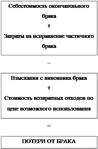 Статья «Потери от брака» имеется, как правило, только в отчетных калькуляциях. В некоторых производствах (литейном, стекольном и др.) брак планируется в технологически неизбежных пределах. Браком считаются изделия и полуфабрикаты, которые по своему качеству не соответствуют установленным стандартам, техническим условиям или договорам. В зависимости от характера дефектов, обнаруженных при оценке готовой продукции или полуфабрикатов, брак делят на исправимый и неисправимый (окончательный). Исправимым браком считаются изделия и полуфабрикаты, которые после исправления могут быть использованы по прямому назначению и исправление которых технически возможно и экономически целесообразно. Неисправимым (окончательным) браком считаются изделия и полуфабрикаты, которые не могут быть использованы по прямому назначению и исправление которых технически невозможно и экономически нецелесообразно. Такие изделия реализуют по ценам возможного использования или используют в качестве вторичного сырья для переработки на другие виды продукции. В зависимости от места обнаружения различают брак внутренний и внешний. Внутренним считают брак, обнаруженный в организации до отправки покупателю. Внешним – брак, обнаруженный после отпуска продукции покупателю. Потери от неисправимого брака исчисляют вычитанием из его себестоимости стоимости забракованных изделий по ценам возможного использования и сумм, удерживаемых с виновников брака. В организациях с большой номенклатурой изделий брак обычно оценивают исходя из плановой или нормативной себестоимости. Себестоимость внутреннего исправимого брака определяют исходя из стоимости сырья, материалов и полуфабрикатов, израсходованных на исправление брака, заработной платы производственных рабочих, занятых исправлением брака, отчислений на социальные нужды и соответствующей доли общепроизводственных расходов. Потери от внутреннего исправимого брака определяют вычитанием из его себестоимости сумм, удерживаемых с виновников брака. В себестоимость внутреннего окончательного и исправимого брака, происшедшего по вине поставщиков сырья, материалов и полуфабрикатов, включают также соответствующую долю общехозяйственных расходов (как правило, в процентном отношении по утвержденному плану к оплате труда работников, начисленной за операции до момента обнаружения окончательного брака или до момента доработки исправимого брака). Стоимость внешнего брака состоит из производственной себестоимости забракованной продукции, расходов по приобретению этой продукции покупателями, а также транспортных расходов при замене забракованной продукции или расходов потребителя на исправление забракованной продукции. Штрафы, уплаченные покупателям за поставку бракованной продукции, относят на счет 91 «Прочие доходы и расходы» и в стоимость потерь от брака не включают. Синтетический учет потерь от брака ведут на активном счете 28 «Брак в производстве». По дебету этого счета отражают затраты по исправлению частичного брака (с кредита счетов 10 «Материалы», 70 «Расчеты с персоналом по оплате труда» и др.), а также себестоимость окончательного брака (с кредита соответствующего счета производства). Потери от брака списывают с кредита счета 28 «Брак в производстве» в дебет различных счетов в зависимо