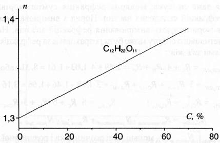 а також за сумою атомних рефракцій і рефракцій зв'язків, то збіг знайдених числових величин рефракцій служить підтвердженням висновків стосовно природи речовини. Кількісний рефрактометричний аналіз базується на залежності показника заломлення від концентрації речовини в розчині. Наприклад, крива залежності показника заломлення розчину сахарози від концентрації сахарози має вигляд, представлений на рис.3. Рефрактометричний аналіз використовується для визначення зв'язаної води в різноманітних продуктах, які містять високомолекулярні речовини. Суть цього визначення зводиться до наступного: певну кількість продукту, наприклад крохмалю, поміщають на 20-30 хв у водний розчин сахарози з відомою концентрацією. Відбувається зв'язування води крохмалем, внаслідок чого концентрація сахарози в розчині збільшується. За величиною зміни концентрації сахарози та наважкою крохмалю розраховують кількість зв'язаної води.
