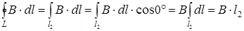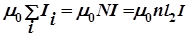 где учтено, что величина и направление вектора B на участке l2 внутри соленоида для всех dl i одинаковы. Пусть на единицу длины соленоида приходится n витков. Тогда контур L будет охватывать N = n · l 2проводников с током I, а значит