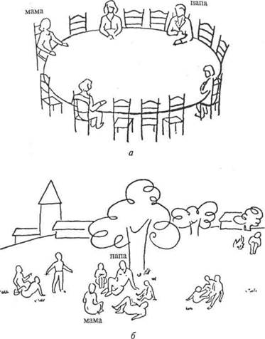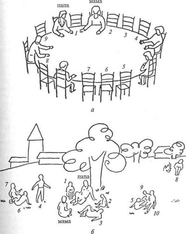 Адаптированный вариант детской методики для изучения межличностных отношений Рене Жиля является хорошим примером методик, в которых структура обследуемых межличностных отношений ребенка выходит далеко за пределы чисто родительско-детских отношений в семье [Гильяшева И. Н., Игнатьева Н.Д., 1994]. Методика «Межличностные отношения ребенка» Жиля — это визуально-вербальная проективная методика, состоящая из рисунков и текстовых задач. Изображения на картинках выполнены схематично, что облегчает процесс идентификации испытуемых с персонажами. Например, изображена семья, расположившаяся вокруг стола (см. рис. 6, а), или на прогулке за городом (см. рис. 6, б), или группа играющих детей, или детей, слушающих взрослого, или ссорящихся детей. Инструкция: а) вот стол, за которым сидят разные люди. Покажи или обозначь крестиком, где сядешь ты. б) ты на прогулке за городом. Покажи или обозначь крестиком, где находишься ты. Ребенку предлагается выбрать себе место среди изображенных людей либо идентифицировать себя с персонажем, занимающим то или иное место в группе. В текстовых заданиях предлагаются на выбор типичные формы поведения в определенных ситуациях. Например: «С кем ты любишь играть: с товарищами твоего возраста, младше тебя, старше тебя?» Или: «Твой товарищ нарочно толкнул тебя, да так, что ты упал. Что ты будешь делать? Заплачешь? Пожалуешься на него? Ударишь? Сделаешь ему замечание? Ничего не скажешь?» Всего методика содержит 42 вопроса. При обследовании по данной методике от ребенка не требуется развернутого рассказа, достаточно знать его выбор: кто выбран и в какой ситуации, где и на каком расстояний от определенных лиц помещает себя ребенок, какие варианты поведения он предпочитает в предлагаемых ему текстовых заданиях. Эта простота и легкость ответа делают методику пригодной для детей от старшего дошкольного до подросткового возраста. Особенности методики дают возможность относительно большой ее формализации. Помимо качественной оценки Результатов детская проективная методика позволяет представить результаты обследования и количественно. Методика измеряет 12 параметров, которые можно условно разделить на две больше группы переменных.