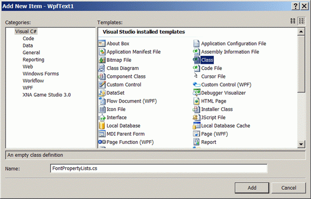 Добавьте к проекту новый файл с именем FontPropertyLists.cs