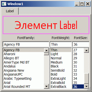 Заполните файл Window1.xaml следующей разметкой < Window x: Class=" WpfText1.Window1" xmlns=" https://schemas.microsoft.com/winfx/2006/xaml/presentation" xmlns: x=" https://schemas.microsoft.com/winfx/2006/xaml" Title=" Window1" Background=" LightGray" Height=" 300" Width=" 300" MinHeight=" 300" MinWidth=" 300" ResizeMode=" CanResizeWithGrip" WindowStartupLocation=" CenterScreen" FocusManager.FocusedElement=" {Binding ElementName='fontSizeListBox'}" > < TabControl> <! --Вкладка Label--> < TabItem Header=" Label" > <! --Сетка 4x3--> < Grid> < Grid.RowDefinitions> < RowDefinition Height=" 60" /> < RowDefinition Height=" Auto" /> < RowDefinition Height=" Auto" /> < RowDefinition Height=" *" /> < /Grid.RowDefinitions> < Grid.ColumnDefinitions> <! --Пропорции ширины столбцов--> < ColumnDefinition Width=" 2.7*" /> < ColumnDefinition Width=" 1.3*" /> < ColumnDefinition Width=" 1*" /> < /Grid.ColumnDefinitions> < Border Grid.Row=" 0" Grid.ColumnSpan=" 3" BorderThickness=" 3" BorderBrush=" Violet" > < Label VerticalContentAlignment=" Center" HorizontalContentAlignment=" Center" Foreground=" Red" FontWeight=" {Binding ElementName=fontWeightListBox, Path=SelectedItem}" FontSize=" {Binding ElementName=fontSizeListBox, Path=SelectedItem}" FontFamily=" {Binding ElementName=fontFamilyListBox, Path=SelectedItem}" Content=" Элемент Label" /> < /Border> < Label Grid.Row=" 1" Grid.Column=" 0" HorizontalContentAlignment=" Center" Content=" FontFamily: " /> < TextBox Grid.Row=" 2" Grid.Column=" 0" Name=" fontFamilyTextBox" Text=" {Binding ElementName=fontFamilyListBox, Path=SelectedItem}" TextChanged=" fontFamilyTextBox_TextChanged" /> < ListBox Grid.Row=" 3" Grid.Column=" 0" Name=" fontFamilyListBox" SelectedIndex=" 0" /> < Label Grid.Row=" 1" Grid.Column=" 1" HorizontalContentAlignment=" Center" Content=" FontWeight: " /> < TextBox Grid.Row=" 2" Grid.Column=" 1" Name=" fontWeightTextBox" Text=" {Binding ElementName=fontWeightListBox, Path=SelectedItem}" TextChanged=" fontWeightTextBox_TextChanged" /> < ListBox Grid.Row=" 3" Grid.Column=" 1" Name=" fontWeightListBox" SelectedIndex=" 0" /> < Label Grid.Row=" 1" Grid.Column=" 2" HorizontalContentAlignment=" Center" Content=" FontSize: " /> < TextBox Grid.Row=" 2" Grid.Column=" 2" Name=" fontSizeTextBox" Text=" {Binding ElementName=fontSizeListBox, Path=SelectedItem}" TextChanged=" fontSizeTextBox_TextChanged" /> < ListBox Grid.Row=" 3" Grid.Column=" 2" Name=" fontSizeListBox" SelectedIndex=" 0" /> < /Grid> < /TabItem> < /TabControl> < /Window> -
