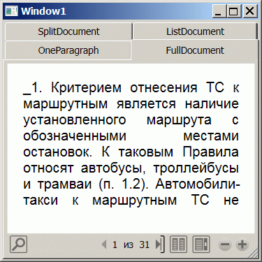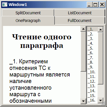 5. < Window x: Class=" WpfText6.Window1" 6. xmlns=" https://schemas.microsoft.com/winfx/2006/xaml/presentation" 7. xmlns: x=" https://schemas.microsoft.com/winfx/2006/xaml" 8. Title=" Window1" 9. Height=" 300" 10. Width=" 300" 11. MinHeight=" 300" 12. MinWidth=" 300" 13. ResizeMode=" CanResizeWithGrip" 14. Loaded=" Window_Loaded" 15. > 16. < TabControl> 17. 18. < TabItem Header=" OneParagraph" > 19. < Grid> 20. < Grid.ColumnDefinitions> 21. < ColumnDefinition /> 22. < ColumnDefinition Width=" 50" /> 23. < /Grid.ColumnDefinitions> 24. < FlowDocumentScrollViewer 25. DockPanel.Dock=" Left" 26. x: Name=" flowDocumentScrollViewer" 27. ScrollViewer.VerticalScrollBarVisibility=" Visible" 28. > 29. < FlowDocument Name=" flowDoc" TextAlignment=" Left" Background=" White" > 30. < Paragraph TextAlignment=" Center" FontWeight=" Bold" FontSize=" 21" > 31. Чтение одного параграфа32. < /Paragraph> 33. < Paragraph Name=" text" FontFamily=" Arial" /> 34. < /FlowDocument> 35. < /FlowDocumentScrollViewer> 36. < ListBox Grid.Column=" 1" Name=" listBox" 37. SelectionChanged=" listBox_SelectionChanged" /> 38. < /Grid> 39. < /TabItem> 40. 41. < TabItem Header=" FullDocument" > 42. < FlowDocument Name=" fullDocument" Loaded=" fullDocument_Loaded" /> 43. < /TabItem> 44. 45. < TabItem Header=" SplitDocument" > 46. < FlowDocumentScrollViewer ScrollViewer.VerticalScrollBarVisibility=" Auto" > 47. < FlowDocument Name=" splitDocument" 48. Loaded=" splitDocument_Loaded" Background=" White" /> 49. < /FlowDocumentScrollViewer> 50. < /TabItem> 51. 52. < TabItem Header=" ListDocument" > 53. < FlowDocumentScrollViewer ScrollViewer.VerticalScrollBarVisibility=" Auto" > 54. < FlowDocument Name=" listDocument" 55. Initialized=" listDocument_Initialized" Background=" White" /> 56. < /FlowDocumentScrollViewer> 57. < /TabItem> 58. < /TabControl> < /Window> - Сочинил, думая!, кодовую часть так