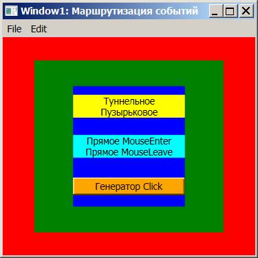 Теперь осталось последовательно щелкать на отдельные элементы графического окна и в консольном окне наблюдать за маршрутизацией событий по последовательности срабатывания обработчиков. Для удобства можно пользоваться всплывающей подсказкой. Ниже приведены результаты, для группировки которых использован цвет фона элемента: