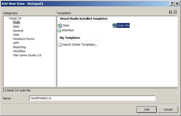 Выделите узел текущего проекта и добавьте командой Project/Add New Item новый файл Code File с именем CaretPosition.cs