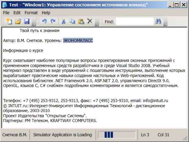 Заполните файл CaretPosition.cs следующим кодом using System; using System.Windows; using System.Windows.Controls.Primitives; using System.Windows.Controls; namespace Notepad2{ // Часть класса главного окна partial class Window1 { // Создаем экземпляр и регистрируем обработчики CaretPosition caretPosition; private void CreateCaretPosition() { // Отображение в StatusBar номера строки и столбца caretPosition = new CaretPosition(); // Создаем объект caretPosition.TxtBox = txtBox1; // Присоединяем TextBox // Дополняем StatusBar this.statusBar.Items.Add(new System.Windows.Controls.Separator()); this.statusBar.Items.Add(caretPosition.StrLineCol); // Увековечиваем себя! this.statusBar.Items.Insert(0, new System.Windows.Controls.Separator()); this.statusBar.Items.Insert(0, " Снетков В.М."); // Регистрируем обработчик события перемещения каретки txtBox1.SelectionChanged += new RoutedEventHandler(txtBox1_SelectionChanged); } // Обработчик инициирует вычисление и отрисовку нового положения void txtBox1_SelectionChanged(object sender, RoutedEventArgs e) { caretPosition.CaretChanged(); } } class CaretPosition { // Закрытые поля StatusBarItem strLineCol = new StatusBarItem(); TextBox txtBox = new TextBox(); // Открытые свойства // Для добавления в строку состояния клиента public StatusBarItem StrLineCol // Папа '--> ' { // Только для чтения get { return strLineCol; } } // Для присоединения к TextBox клиента public TextBox TxtBox // Мама '> --' { // Только для записи set { txtBox = value; } } // Вычисляет номер строки int GetLine() { int count = 0; int pos = 0; int caretPos = txtBox.SelectionStart + 1; //txtBox1.CaretIndex while (pos < caretPos) { count++; // Счетчик строк pos = txtBox.Text.IndexOf(" \r\n", pos); // \n - перевод строки if (pos! = -1) // Нашли очередную пару pos += 2; // Сдвигаемся правее найденных else break; // Больше нет } return count; } public void CaretChanged() { if (! txtBox.IsFocused) return; int posChar = txtBox.CaretIndex; int line = GetLine(); int column = posChar - txtBox.GetCharacterIndexFromLineIndex(line - 1) + 1; // Обновляем в строке состояния strLineCol.Content = String.Format(" Ln {0} \t Col {1}", line, column); } }} -