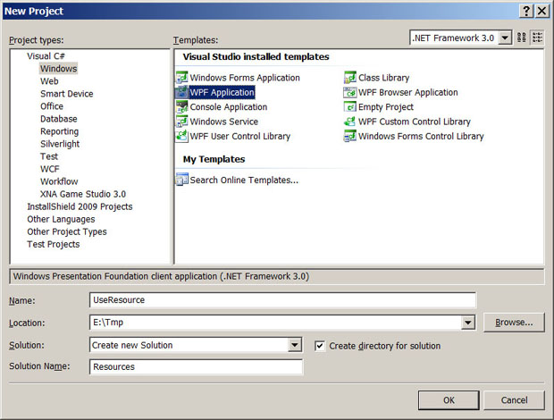Создайте новое решение с именем Resources командой File/New/Project и новый проект с именем UseResource