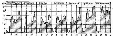где Qч.ср., Qч.ср.л. — часовые расходы тепла, кДж/ч, определяемые по формулам (1.22), (1.26); zot — продолжительность отопительного периода, ч/год; 8400 — общее число часов работы в году горячего водоснабжения, учитывающее 15-суточный перерыв на профилактику и ремонты. Потребление горячей воды в жилых зданиях неравномерно в течение суток к по дням недели. Общее представление об этом дают рис. 1.1—1.3. На рис. 1.1 показано внутрисуточное изменение расхода горячей воды в отдельном здании, полученное по показаниям записывающего счетчика; на рис. 1.2 показано изменение расхода горячей воды по дням недели в центральном тепловом пункте, обслуживающем около 3000 чел.; на рис. 1.3 приведен более подробный график расходов воды по дням недели в другом ЦТП с указанием расходов воды по отдельным часам суток. Конкретные виды таких графиков могут несколько различаться в зависимости от режима работы и привычек населения. Однако в расходах горячей воды в жилых зданиях наблюдаются и некоторые общие закономерности, заключающиеся в почти полном прекращении расхода воды в ночные часы, в наличии повышенных расходов воды в утренние (с 8 до 12) и вечерние (с 18 до 22) часы, в увеличении суточных расходов воды в нерабочие (суббота, воскресенье) и предпраздничные дни примерно на 20—30% по сравнению с расходом воды в остальные (рабочие) дни недели.