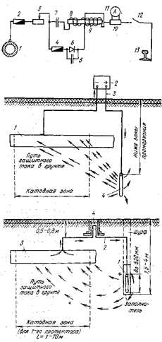 К активным методам защиты относят катодную и протекторную защиту и электрический дренаж. Основным методом защиты газопроводовот блуждающих токов является электрический дренаж. Он заключается в отводе токов, попавших на газопровод, обратно к источнику. Отвод осуществляют через изолированный проводник, соединяющий газопровод с рельсом электрифицированного транспорта или минусовой шиной тяговой подстанции. При отводе тока из газопровода по проводнику прекращается выход ионов металла в грунт и тем самым прекращается электрическая коррозия газопровода. Для отвода тока, как правило, используют поляризованный электродренаж. Он обладает односторонней проводимостью от газопровода к рельсам (минусовой шине). При появлении положительного потенциала на рельсах электрическая цепь дренажа автоматически разрывается. Рис. 4.15. Электрическая схема поляризованного дренажа 1 — газопровод; 2 — предохранитель на 350 А; 3 — сопротивление; 4 — предохранитель на 15 А; 5 и 7 — контакты; 6 — диод; 8 — дре-нажная обмотка; 9 — включающая обмотка; 10 — шпунт амперметра; 11 — амперметр; 12 — рубильник; 13 — рельс Рис. 4.16. Схема катодной защиты 1 — защищаемый газопровод; 2 —источник постоянного тока; 3 —соединительный кабель; 4 — заземлнтель анод Рис. 4.17. Схема протекторной зашиты, 1 — протектор; 2 — соединительные кабели; 3 — защищаемый газопровод; 4 — контрольный пункт