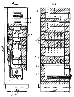 Рис 23.9. Газовая отопительная печь АКХ-14 1 — газогорелочное устройство; 2 — топливник; 3 — кирпичи-насадки; 4 — сборные коллекторы; 5 — рассекатель; 6 — задвижка; 7 — герметичная дверка; 8 — путь движения продуктов горения