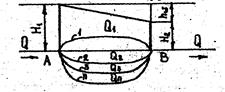 Трубопровод в точке А разветвляется на несколько труб, которые затем вновь объединяются в точке В; расход Q основного трубопровода до деления и после объединения труб один и тот же (рис.). Задача расчета состоит в том, чтобы определить расходы в отдельных ветвях системы Q1, Q2, …, Qn, а также потери напора hw между точками А и В. Общий расход Q диаметры и длины параллельных труб (d1, d2, …, dn; l1, l2, …, ln) предполагаются известными.