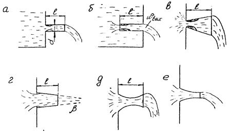 где Hс – превышение горизонта воды в сосуде над центром тяжести большого отверстия; m0 - коэффициент расхода большого отверстия. Большие значения m0 относятся к отверстиям с плавными боковыми и донными подходами к ним. Истечение жидкости через насадки. Насадками называют короткие трубы, имеющие различные формы живого сечения и постоянные или меняющиеся размеры основного канала по длине. Длину насадков обычно принимают равной трем – пяти характерным размерам живого сечения. Насадки применяют для измерения расхода жидкости, организации направленного слива, создания струй фонтанных, пожарных, гидромониторных и др. Воздействием струй воды приводят во вращение колеса ковшовых гидротурбин, струями высокого давления разрушают твердые горные породы, режут металлы и т.д. Поток жидкости, поступающий в насадок, в большинстве случаев отрывается от стенки насадка у входа, сужается, расширяется и вновь касается у выхода. Область отрыва заполнена завихренной массой жидкости. В этой области создается пониженное давление, что увеличивает действующий напор, и поэтому коэффициент расхода насадков выше, чем отверстий (рис.).