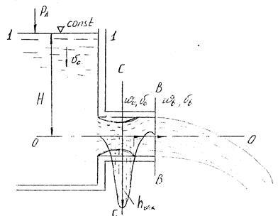 где v1 и vс - средние скорости в соответствующих сечениях; V - коэффициент сопротивления, учитывающий потери напора от сечения 1-1 до сечения С-С (потери сосредоточены главным образом в районе отверстия).