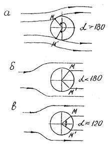 Для твердых тел с резко меняющимся профилем (диски, пластины, расположенные поперек потока кубы, профили зданий и т.п.) коэффициент лобового сопротивления практически не зависит от числа Re. Опытным путем установлена экспериментальная зависимость cx=f(Re) для различных условий движения шаров в жидкости, представленная в логарифмических координатах (рис.). Изменение числа Re влечет за собой изменение соотношения между действующими на тело силами трения, инерции и давления (рис.) Причем увеличение Rе приводит к уменьшению влияния сил трения и повышению влияния сил инерции и давления. Кроме того, при изменении Rе меняется положение точки отрыва пограничного слоя и его структура. До тех пор, пока пограничный слой остается ламинарным (10< Rе< 103), точка отрыва находится в лобовой части сферы (рис. а). При 103< Re< 105 ламинарный пограничный слой постепенно переходит в турбулентный и точка отрыва смещается в кормовую область (рис. б). В этом диапазоне чисел Rе сопротивление увеличивается за счет возрастания действия разности давлений перед шаром и за ним. Кривая cx=f(Re) приближается к горизонтали. Полный переход ламинарного пограничного слоя в турбулентный происходит при Re=Reкр=105. В этом случае угол a»110-120° и величина области отрывного течения становится наименьшей (рис. в). Сопротивление резко уменьшается, такое давление называется кризисом сопротивлений.