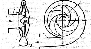 Рис. Схема центробежного насоса 1-входной патрубок; 2-рабочее колесо; 3-корпус; 4-нагнетательный патрубок; 5-лопатка К основным параметрам работы нагнетателей относятся: подача, напор, мощность, КПД нагнетателя. Подача – объем жидкости, подаваемой нагнетателем в единицу времени. Из определения следует, что расход жидкости, проходящей в трубопроводе, равен подаче нагнетателя, сообщающего этой жидкости движение. Подача насоса - Q, м3/с, подача вентилятора – L, м3/с (м3/ч). Напор (давление). Напор нагнетателя - понятие энергетическое. Напор насоса представляет собой энергию, сообщенную единице веса жидкости, прошедшей через насос (H). Давление вентилятора представляет собой энергию, сообщенную единице объема газа, прошедшего через вентилятор (P). Мощность – энергия, сообщаемая или затрачиваемая в единицу времени. Полезная мощность потока жидкости, выходящей из нагнетателя N=QH. Полезная мощность газа, выходящего из вентилятора N=LP. В любой насосной или вентиляторной установке мощность в различных ее узлах не одинакова. Т.к. мощность на валу меньше, чем мощность электрическая, из-за потерь при работе электродвигателя, то необходимо учитывать КПД электродвигателя Nв=Nэhэ. Т.о. нагнетателю подается мощность на валу – потребляемая нагнетателем мощность. Полезная мощность нагнетателя меньше, чем мощность на валу, на величину потерь мощности в нагнетателе. Эти потери мощности учитываются КПД нагнетателя Nп=Nвhн. Потери мощности в нагнетателе подразделяют на гидравлические, объемные и механические. Механическими являются потери мощности на различные виды трения в рабочем органе нагнетателя. Объемные потери возникают в результате утечек жидкости через уплотнения в нагнетателе, а также перетоков из областей высокого давления в области низких, обусловленных особенностями конструкций. Гидравлический КПД учитывает потери, которые возникают вследствие наличия гидравлических сопротивлений в подводе, рабочем колесе и отводе. Характеристики работы насоса изображаются на специальном графике, по которому можно определять параметра работы нагнетателя в конкретной сети. При этом определяется будут ли в сети необходимые значения характеристик при использовании данного нагнетателя.