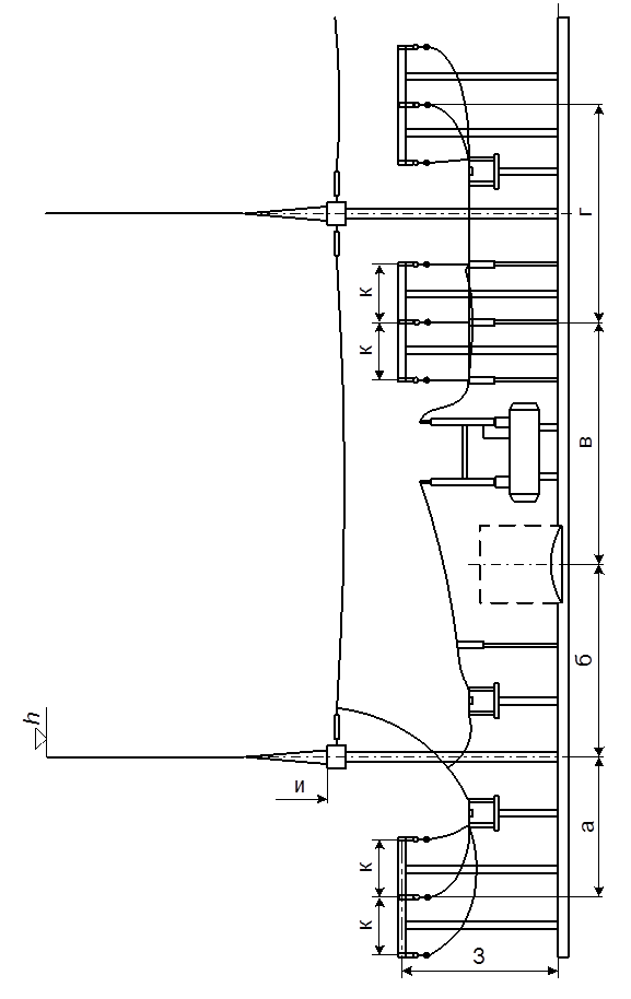 где hx – высота защищаемого объекта, а внешняя часть зоны защиты определяется так же, как и зона защиты системы двух молниеотводов (рис. 4). В рассматриваемом примере молниеотводы целесообразно расположить на линейных порталах (рис.5).