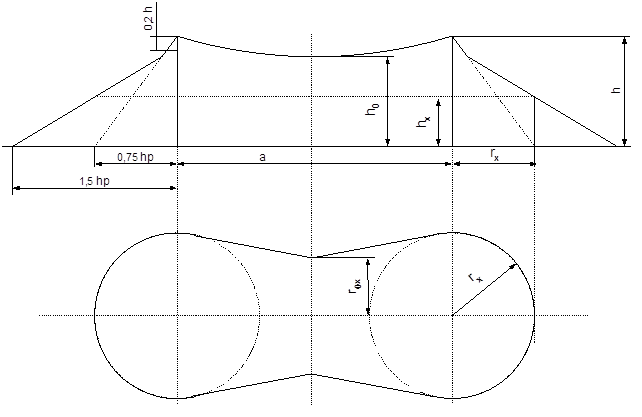 Рис. 4. Построение зоны защиты двух стержневых молниеотводов.