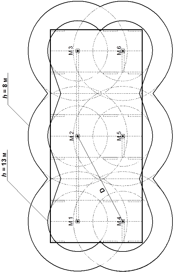 Из расчетов видно, что минимальная высота молниеотводов, обеспечивающая в рассматриваемом примере надежную защиту от ПУМ, должна составлять 25, 8 м, но для удобства расчетов и увеличения надежности защиты примем высоту h = 26 м.