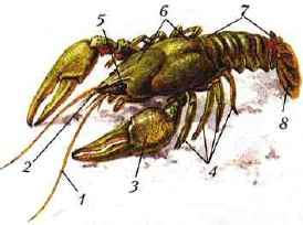 Рис. 85. Различные ракообразные: 1 — краб; 2 — рак-отшельник; 3 — креветка; 4 — мокрица; 5 — бокоплав; 6 — морская уточка; 7 — щитень Особенности строения и жизнедеятельности ракообразных можно рассмотреть на примере речного рака. Образ жизни и внешнее строение. Речной рак обитает в различных пресных водоемах с чистой водой: речных заводях, озерах, больших прудах. Днем раки прячутся под камнями, корягами, корнями прибрежных деревьев, в вырытых ими самими в мягком дне норках. В поисках корма они покидают свои убежища в основном ночью. Речной рак — довольно крупный представитель членистоногих, иногда попадаются экземпляры длиной свыше 15 см. Окраска у речного рака зеленовато-черная. Все тело покрыто прочным и плотным хитиновым панцирем, пропитанным углекислым кальцием. Покровы речного рака служат наружным скелетом. К нему изнутри прикрепляются пучки поперечнополосатых мышц. Твердый панцирь рака мешает животному расти. Поэтому рак периодически (2-3 раза в год) линяет — сбрасывает старые покровы и обретает новые. Во время линьки, пока новый панцирь не окрепнет (на это уходит около полутора недель), рак беззащитен и не может питаться. В это время он прячется в убежищах. Тело речного рака состоит из двух отделов — головогруди и брюшка (рис. 86). На переднем конце головогруди расположена пара длинных и пара коротких усиков — это органы осязания и обоняния. Шаровидные глаза сидят на длинных стебельках. Поэтому рак может одновременно смотреть в разные стороны. В случае опасности он прячет глаза в углублениях панциря.