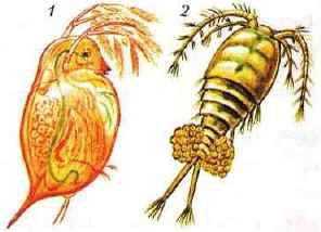 Рис. 88. Молодые рачки на брюшных ножках самки Многообразие ракообразных. Ракообразные ведут ползающий, плавающий или прикрепленный образ жизни. Некоторые из них являются паразитами. Мельчайшие морские ракообразные, составляющие основную массу зоопланктона, служат пищей для многих водных животных — от кишечнополостных до рыб и китов. В некоторых местах ракообразные — основная группа среди донных животных. Люди используют ракообразных в пищу: объектами промысла служат крабы, раки, омары, лангусты, креветки и др. В классе Ракообразные 20 отрядов. К Десятиногим относится речной рак, крупные морские раки — омары (длиной до 60 см, а массой до 15 кг) и лангусты (у них отсутствуют клешни), мелкие рачки — креветки. Некоторые из них передвигаются по дну, другие активно плавают в толще воды при помощи брюшных ножек. К этой же группе принадлежат раки-отшельники. У них мягкое несегментированное брюшко. Раки-отшельники прячутся от врагов в пустых раковинах морских улиток, все время таская раковину с собой, а при опасности полностью скрываясь в ней, прикрывая вход сильно развитой клешней. К десятиногим ракам относятся крабы. У них широкий, но короткий головогрудной панцирь, очень короткие усики, короткое брюшко подогнуто под головогрудь. Передвигаются крабы чаще всего боком. К Листоногим принадлежат хорошо известные аквариумистам мелкие рачки — дафнии длиной 3-5 мм (рис. 89, 1). Они живут в небольших пресных водоемах. Все тело (за исключением головы) у дафний заключено в прозрачный хитиновый панцирь-раковинку. Сквозь хитиновые покровы виден большой сложный глазок и постоянно работающие грудные ножки, которые обеспечивают ток воды под панцирем. У дафнии имеются большие ветвистые усики. Взмахивая ими, она прыгает в воде, поэтому дафний иногда называют «водяными блохами». Питаются дафнии находящимися в толще воды простейшими, бактериями, одноклеточными водорослями.
