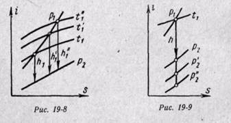 Одновременно с увеличением начальной температуры уменьшается удельный расход пара. В настоящее время используют пар с температурой до 565° С и осваивается пар с температурой до 600°С и выше. Повышение температуры перегрева пара ограничивается свойствами металла, из которого сделаны трубы, выдерживать большие давления при высоких температурах, т. е. конечные параметры пара определяются наличием относительно дешевых жаропрочных металлов. Влияние конечного давления в конденсаторе. Понижение давления в конденсаторе является особенно эффективным средством для повышения термического к. п. д. парового котла. Из is-диаграммы (рис. 19-9) видно, что понижение давления в конденсаторе значительно уменьшает среднеинтегральную температуру отвода тепла и увеличивает адиабатное теплопаденне h, а следовательно, и к. п. д. цикла. Например, при начальном давлении в 100 бар, t1 — 600° С и конечном давлении 1 бар к. п. д. цикла равен 0, 308. При понижении давления в конденсаторе до 0, 3 бар к. п. д. цикла увеличивается до 0, 356. При уменьшении давления до 0, 05 бар, что соответствует температуре насыщения 33 С, к. п. д. цикла возрастает до 0, 417. Однако выбор конечного давления в конденсаторе определяется температурой охлаждающей воды, так как для интенсивного теплообмена разность температур между паром и охлаждающей водой должна быть 10÷ 15° С.