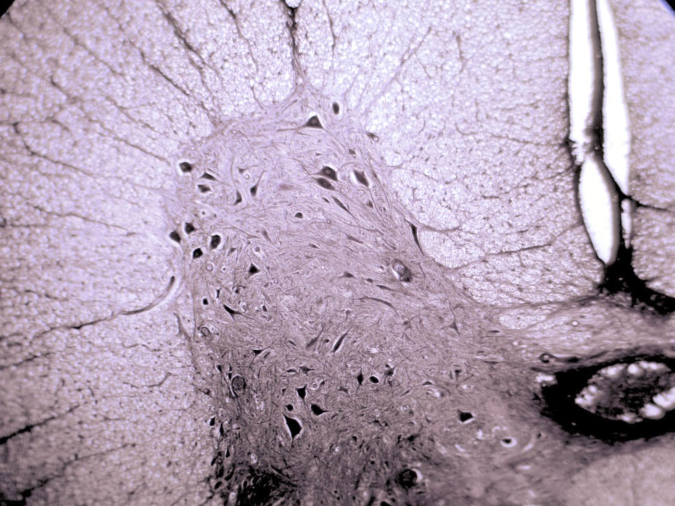 Чувствительное нервное окончание. Пластинчатое нервное тельце. Кожа пальца. Окраска гематоксилин и эозин. Малое увеличение.