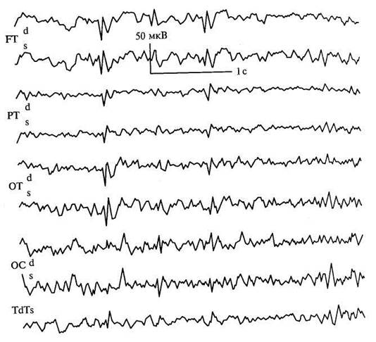 Рис. 91. Электроэнцефалограмма больного эпилепсией При диагностике эпилепсии важное значение имеет семейный анамнез. В анамнезе указывается, не болел ли кто-либоиз членов семьи эпилепсией. Кроме того, в нем отмечают, встречаются ли в семье болезни так называемого эпилептоидного круга. К ним относят приступы мигрени, снохождение, запойное пьянство, ночное недержание мочи, заикание и др. Важно также учитывать эпилептоидные изменения в характере родителей и родственников больного. Важным доказательством генетической обусловленности повышенной судорожной готовности является обнаружение характерных дляэпилепсии изменений на ЭЭГ у здоровых родственников. Лечение эпилепсии комплексное: охранительный, щадящий режим, соблюдение соответствующей диеты, индивидуальный подбор противосудорожных препаратов. Распорядок дня больного следует строго регламентировать. Необходимо исключить дополнительные и эмоциональные нагрузки. Время перед сном должно быть свободно от возбуждающих воздействий — просмотра кинофильмов, телевизионных передач, шумных игр и др. Перед сном рекомендуются прогулки. Длительность сна должна быть не менее 8-10 ч. Необходимо ограничить прием острой и соленой пищи, употребление жидкости. Дети, страдающие эпилепсией, являются группой риска по развитию когнитивных нарушении, так как на когнитивную сферу влияет множество факторов, иногда бывает сложно определить относительную ценность каждого из них. Исследования когнитивной сферы больных эпилепсией дают противоречивые результаты. Встречаются как больные с выраженным повреждением мозга и неврологическим дефицитом, так и совершенно нормальные в неврологическом отношении дети с нормальным интеллектом. Повреждение структуры мозга, лежащее в основе эпилептических приступов, тяжесть и частота приступов, частота субклинических приступов (по ЭЭГ) негативно влияют на когнитивную сферу. АЭП при рациональной терапии уменьшают частоту приступов и субклинических проявлений на ЭЭГ. Следовательно, они положительно влияют на когнитивную сферу больных. Однако АЭП (например, препараты барбитуровой кислоты и бензодиазепины), являясь психоактивными, могут оказывать угнетающее действие. Этот эффект может быть постоянным и может колебаться в течение суток в зависимости от уровня препарата в плазме крови. Эффективность препаратов зависит от дозы и комбинации нескольких АЭП. Однако препараты последнего поколения, особенно ламотриджин, положительно влияют на когнитивные функции. Социально-психологические факторы также влияют на когнитивную сферу. Особенно это касается детей с частыми и тяжелыми приступами. С возрастом при персистировании приступов у большинства пациентов (по некоторым данным — до 80 %) выявляются стойкие нарушения психики, обусловленные вовлечением обеих височных долей и прежде всего лимбической системы. Отмечаются интеллектуально-мнестические или эмоционально-личностные расстройства. Прогрессирующие расстройства памяти являются кардинальным симптомом битемпоральной височной эпилепсии. Стойкие мнестические нарушения касаются главным образом текущих событий. Типичны постоянная забывчивость, трудности запоминания нового материала. Происходит ослабление веральной и зрительной памяти (модально-неспецифические нарушения). Больные могу